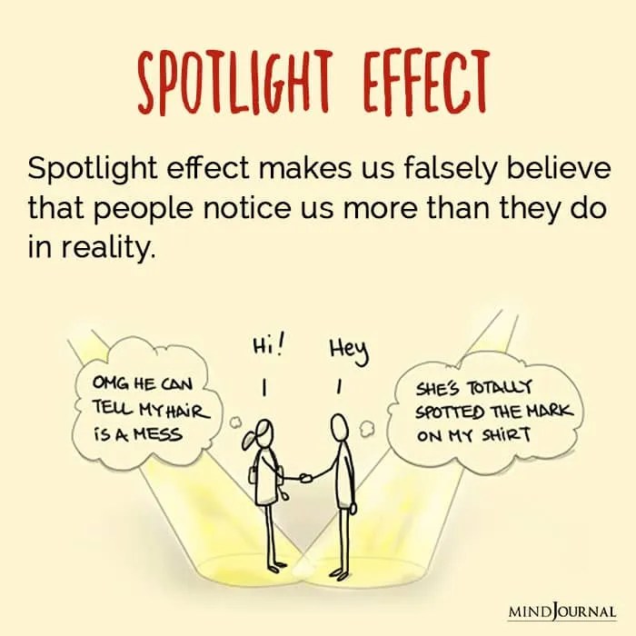 - Feel like we are always “on stage” in social situations—as if we’re under a metaphorical spotlight, being judged and evaluated by an audience that, in truth, barely notices.