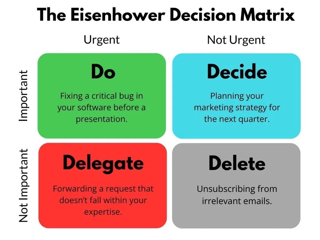 The Eisenhower Matrix (also called the Urgent-Important Matrix) is a super simple decision-making tool that helps you prioritize your tasks by asking just two questions: