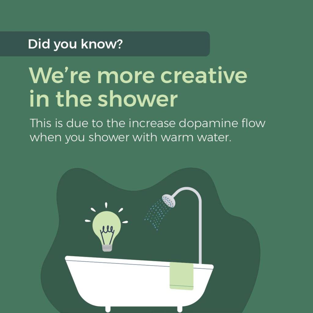 • You’re relaxed – The warm water helps your body release dopamine, the feel-good chemical. And dopamine also boosts creative thinking.