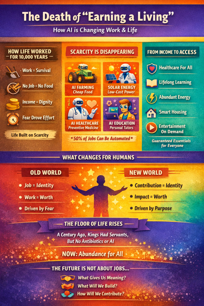 The death of “earning a living” does not signal the end of ambition, effort, or excellence. It marks the end of fear as the primary driver of human life. What replaces it—purpose, creativity, wisdom, or distraction—will shape the next chapter of civilization. And that chapter will be written less by machines, and more by the choices humans make when they are finally free to choose.