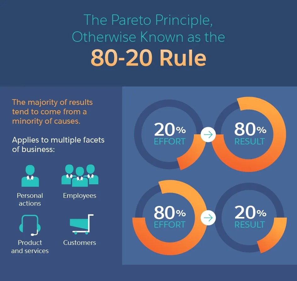 The Pareto principle, also known as the 80/20 rule, comes from many such observations of Vilfredo Pareto, who noticed that outcomes in life are rarely evenly distributed. In simple terms, it suggests that a small part of causes usually creates a large part of results. Roughly speaking, 20% of inputs lead to 80% of outcomes — whether it is 20% of customers generating 80% of profits, 20% of habits shaping 80% of health, or 20% of efforts producing 80% of success.