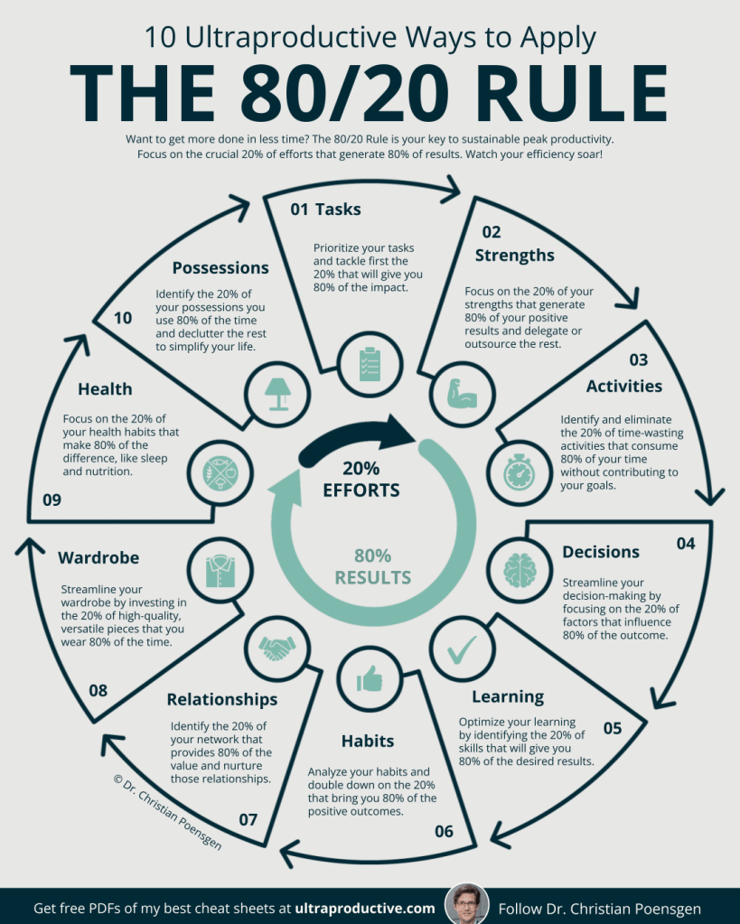 As management thinker Peter Drucker famously hinted: efficiency is doing things right, effectiveness is doing the right things. The 80/20 rule is really a shortcut to effectiveness.