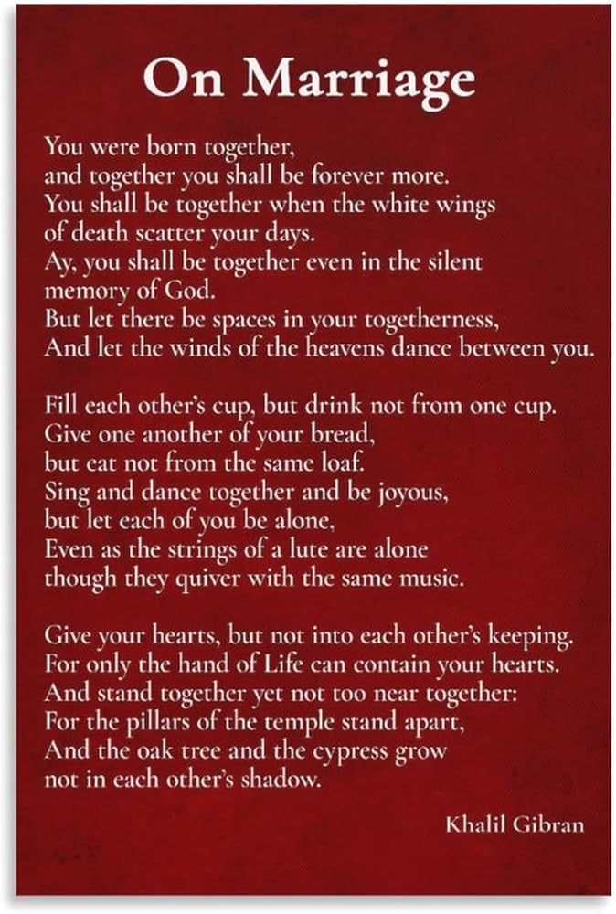 Marriage, Gibran suggests, is not about dissolving into each other, but about standing together while remaining whole. Love should not bind or possess; it should give space, like the distance between the pillars of a temple that hold the same roof. Share your joys and sorrows, but do not lose your inner world. Give freely, yet do not demand ownership. Walk side by side, not in each other’s shadows. For love grows strongest not when two lives merge into one, but when two complete individuals choose, again and again, to walk the same path with respect, freedom, and grace.